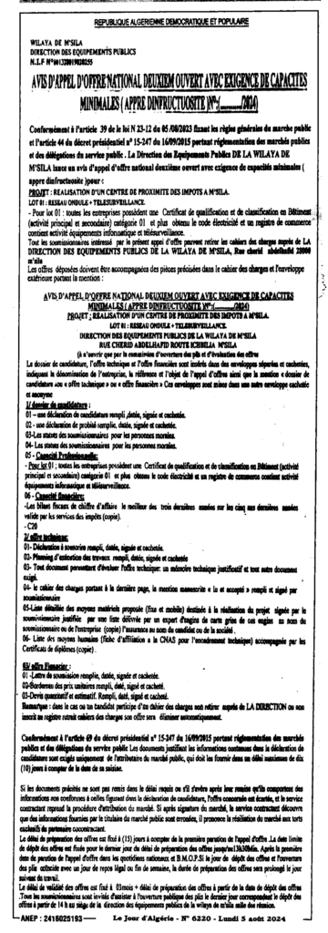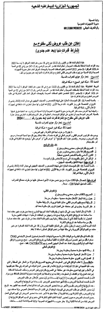 إعلان عن طلب عروض ثاني مفتوح (بعد عدم جدوى) إنجاز مركب جواري للضرائب يالمسيلة/ مديرية التجهيزات العمومية لولاية المسيلة
