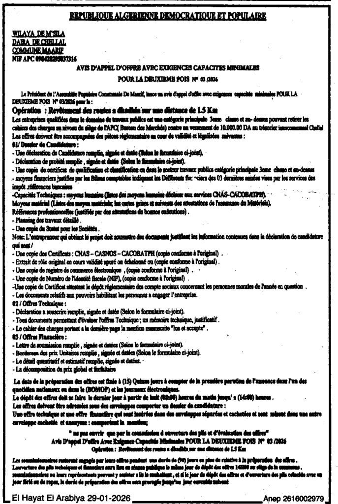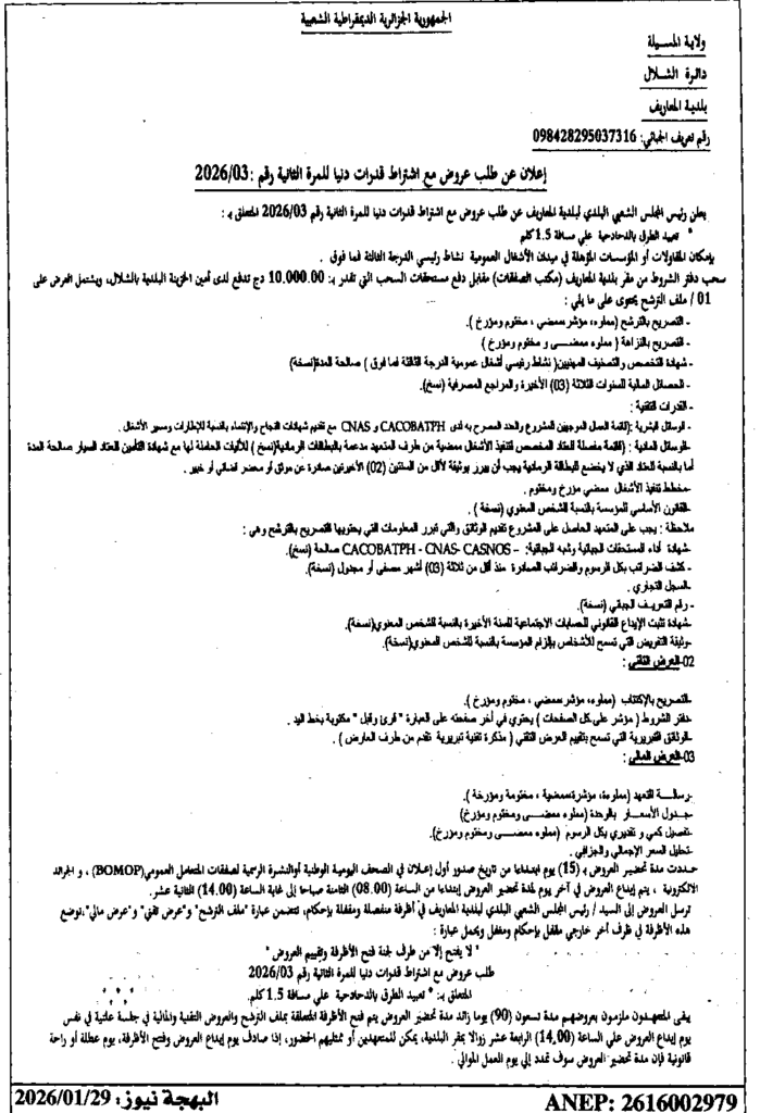 إعلان عن طلب عروض للمرة الثانية 2026/03 بلدية المعاريف