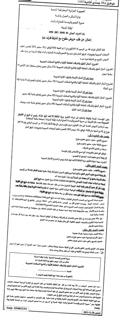 إعلان عن طلب عروض مفتوح: أشغال الطرق والشبكات المختلفة الأولية والثانوية للسكنات العمومية/ مديرية التعمير والهندسة المعمارية والبناء لولاية المسيلة