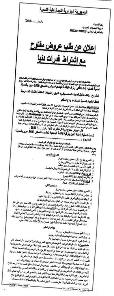 إعلان عن طلب عروض مفتوح: إعادة تأهيل الإقامة الجامعية شبشوب الصادق 3500 سرير بالمسيلة/ مديرية التجهيزات العمومية لولاية المسيلة