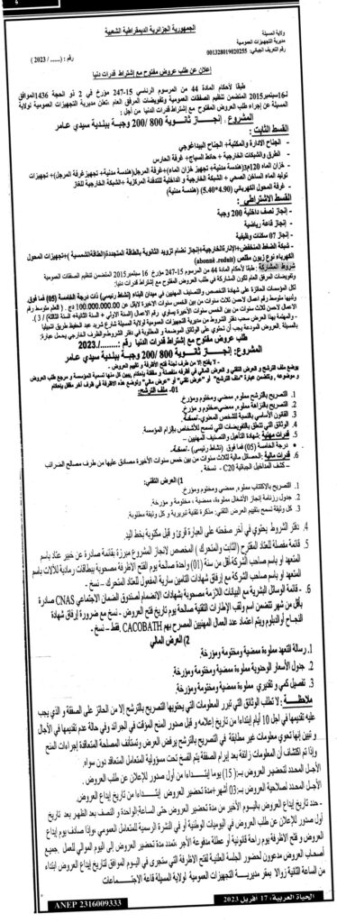إعلان عن طلب عروض مفتوح: إنجاز ثانوية 200/800 وجبة ببلدية سيدي عامر مديرية التجهيزات العمومية لولاية المسيلة