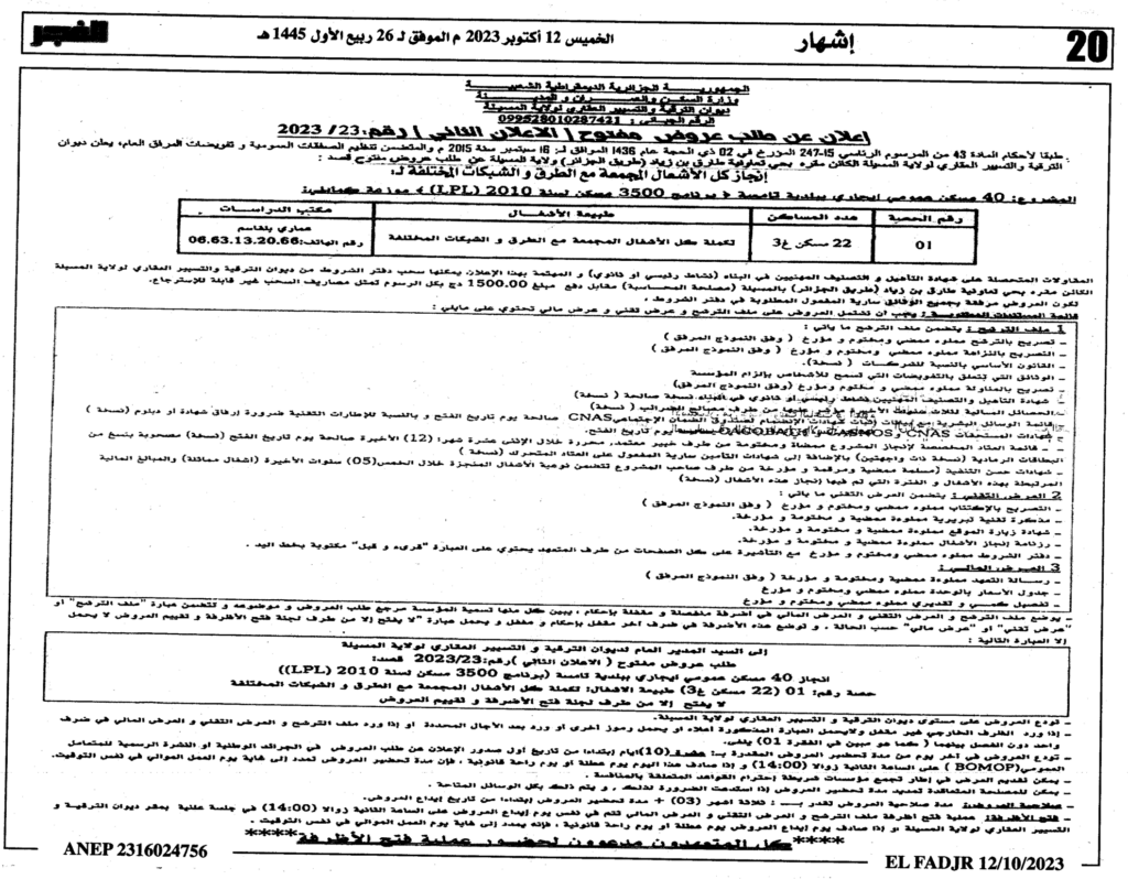 إعلان عن طلب عروض مفتوح (الإعلان الثاني) 2023/23 ديوان الترقية والتسيير العقاري لولاية المسيلة