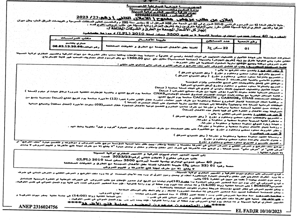 إعلان عن طلب عروض مفتوح (الإعلان ثاني) 2023/23 ديوان الترقية والتسيير العقاري لولاية المسيلة
