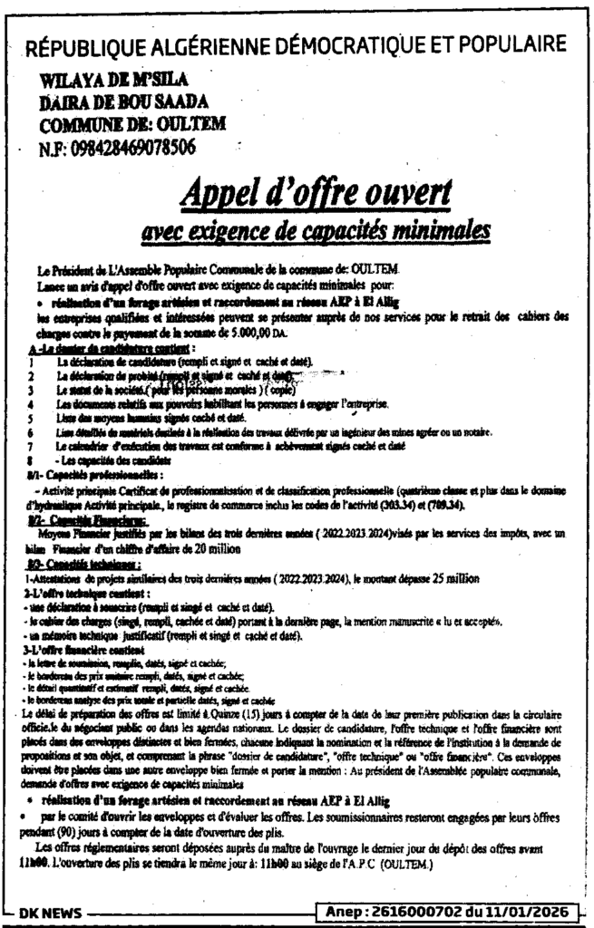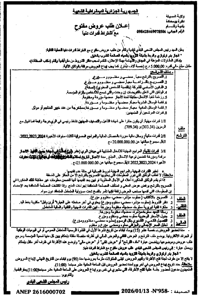 إعلان عن طلب عروض مفتوح انجاز بئر ارتوازي والربط بالشبكة تزويد بالمياه الصالحة للشرب بالعليق/ بلدية ولتام