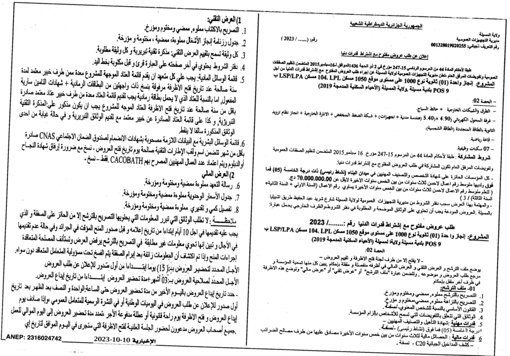 إعلان عن طلب عروض مفتوح: انجاز ثانوية نوع 1000 على مستوى موقع 1050 مسكن LPL/ مديرية التجهيزات العمومية لولاية المسيلة