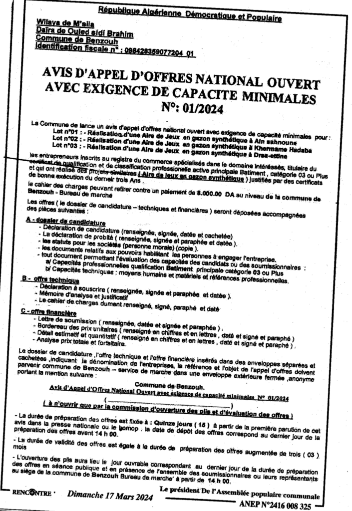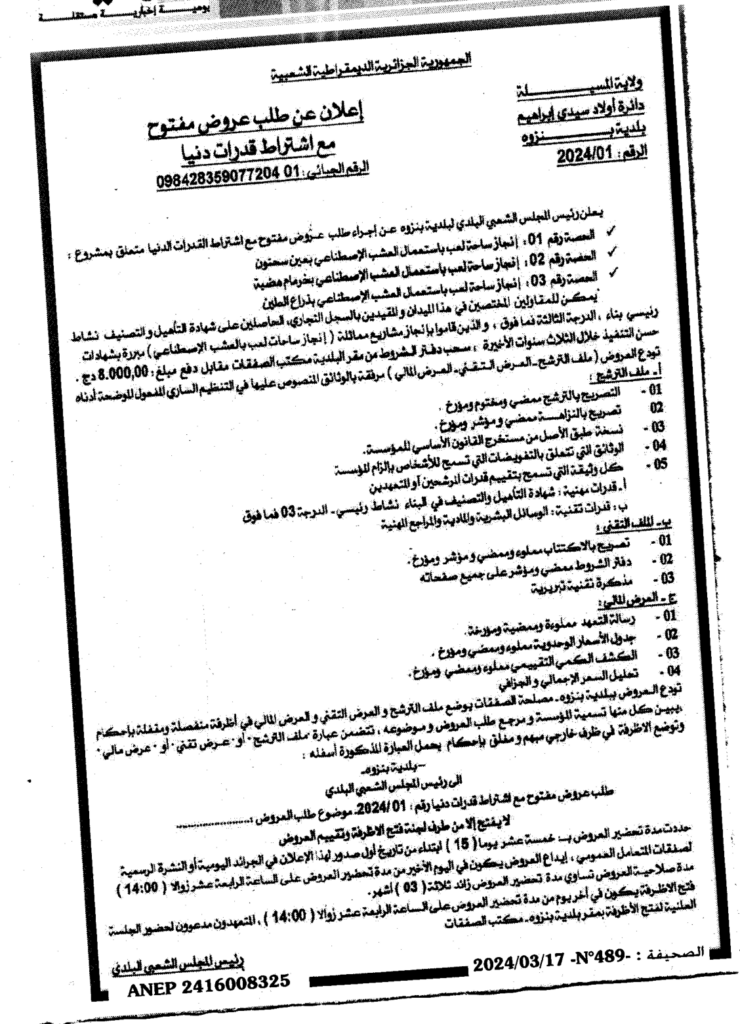 إعلان عن طلب عروض مفتوح: انجاز ساحة اللعب باستعمال العشب الاصطناعي ببلدية بن زوه