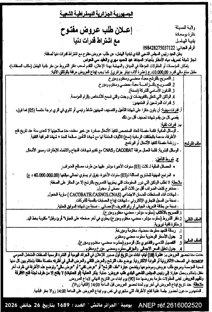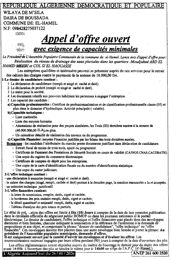 إعلان عن طلب عروض مفتوح انجاز شبكة تصريف مياه الامطار/ بلدية الهامل