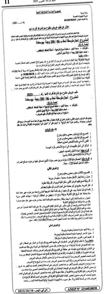 إعلان عن طلب عروض مفتوح: انجاز متوسطة نمط ب 200/06 وجبة ببوسعادة/ مديرية التجهيزات العمومية لولاية المسيلة