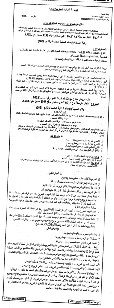 إعلان عن طلب عروض مفتوح: انجاز متوسطة نوع ‘ق06’ على مستوى موقع 1998 مسكن حي AADL/ مديرية التجهيزات العمومية لولاية المسيلة