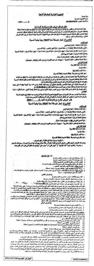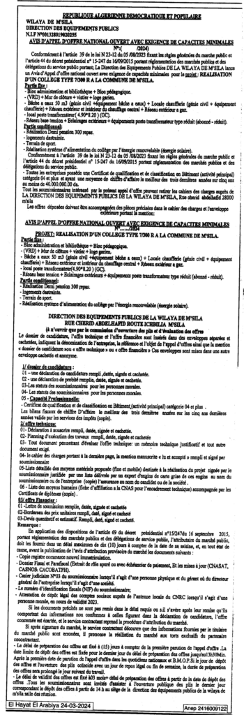 إعلان عن طلب عروض مفتوح: انجاز متوسطة نمط 300/07 وجبة بلدية المسيلة/ مديرية التجهيزات العمومية لولاية المسيلة