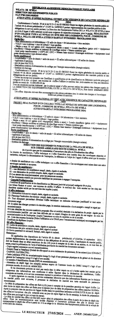 إعلان عن طلب عروض مفتوح: انجاز متوسطة نوع 06 على مستوى 1050 مسكن POS 09 بلدية المسيلة/ مديرية التجهيزات العمومية لولاية المسيلة