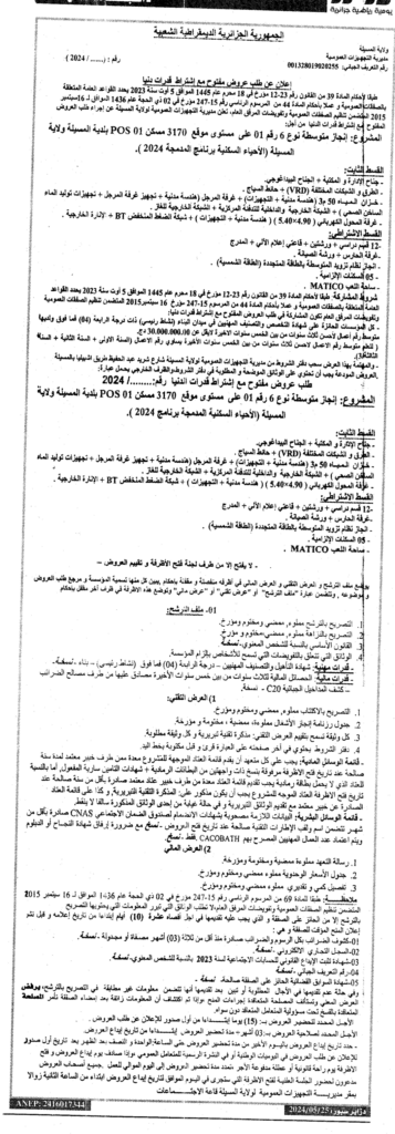 إعلان عن طلب عروض مفتوح: انجاز متوسطة نوع 06 رقم 01 على مستوى موقع 3170 مسكن 01 POS بلدية المسيلة/ مديرية التجهيزات العمومية لولاية المسيلة
