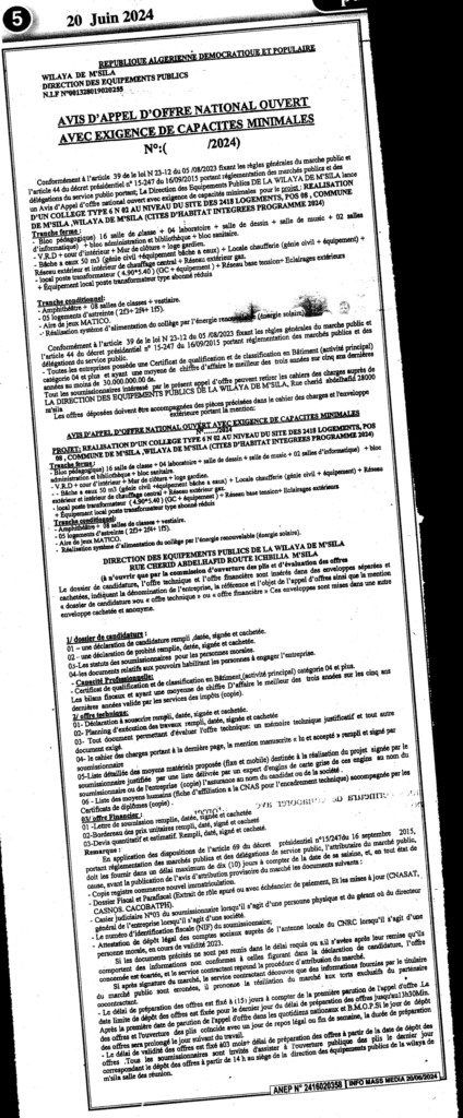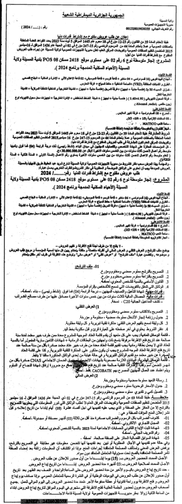 إعلان عن طلب عروض مفتوح انجاز متوسطة نوع 6 رقم 02 على مستوى موقع 2418 مسكن POS 08 بلدية المسيلة/ مديرية التجهيزات العمومية لولاية المسيلة