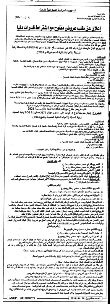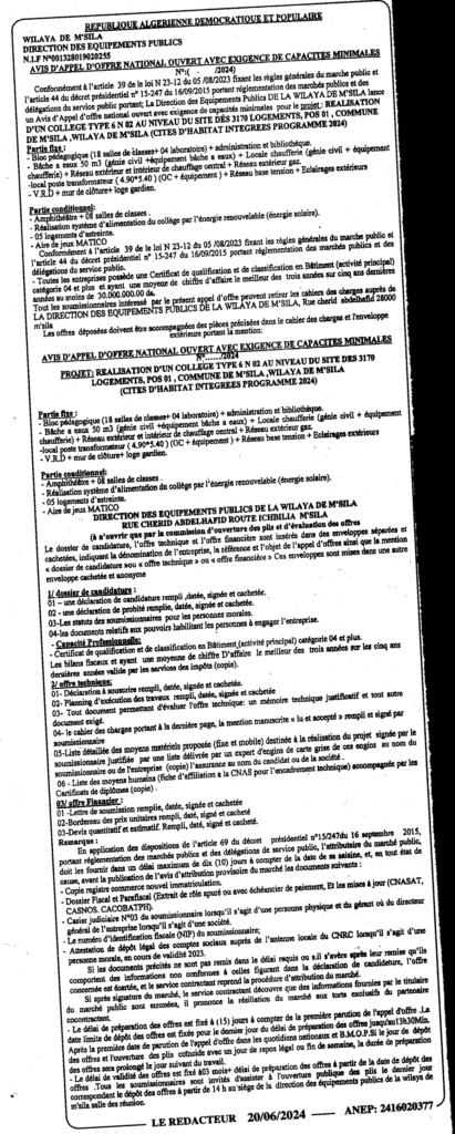 إعلان عن طلب عروض مفتوح انجاز متوسطة نوع 6 رقم 02 على مستوى موقع 3170 مسكن POS بلدية المسيلة/ مديرية التجهيزات العمومية لولاية المسيلة