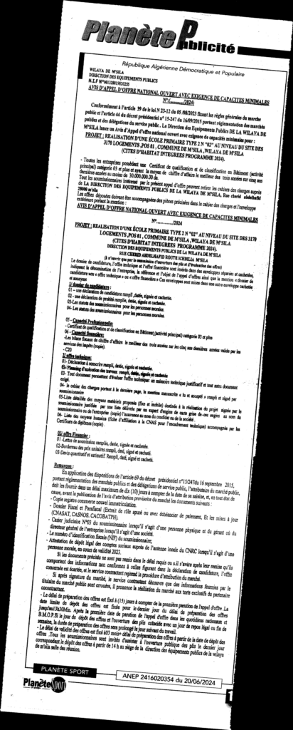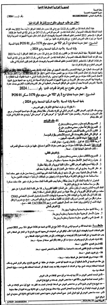 إعلان عن طلب عروض مفتوح انجاز مدرسة ابتدائية نوع 2 رقم 02 على مستوى موقع 3170 مسكن 01 POS بلدية المسيلة/ مديرية التجهيزات العمومية لولاية المسيلة