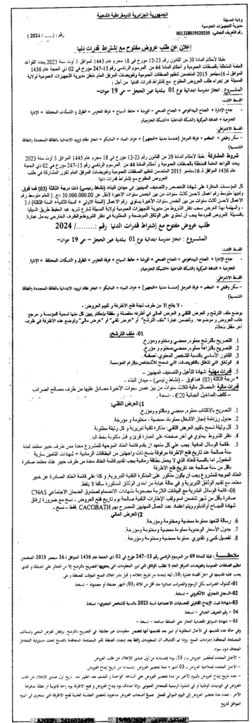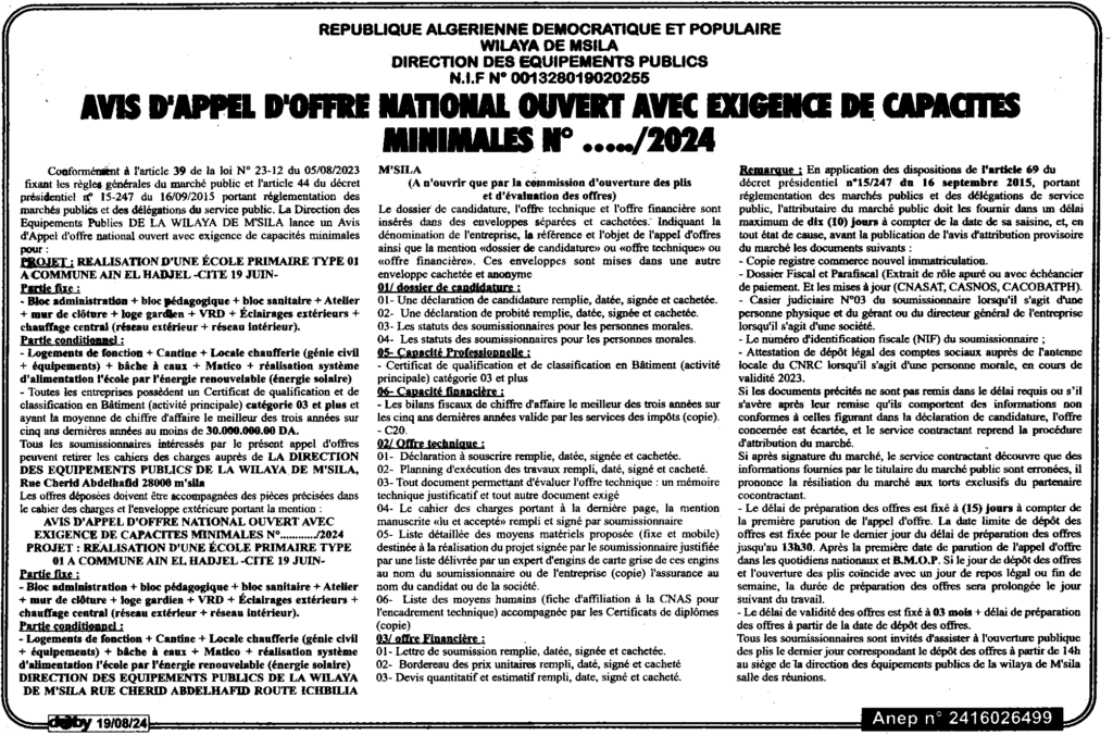 إعلان عن طلب عروض مفتوح انجاز مدرسة ابتدائية نوع 01 ببلدية عين الحجل -حي 19 جوان -/ مديرية التجهيزات العمومية لولاية المسيلة