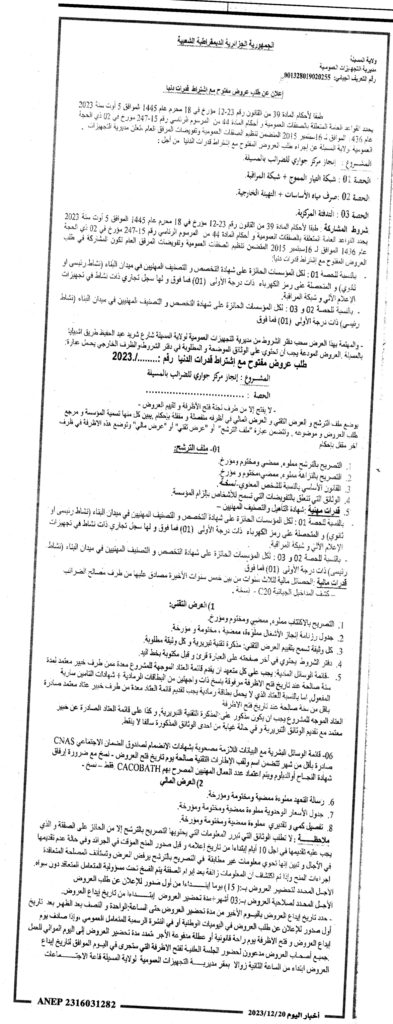 إعلان عن طلب عروض مفتوح: انجاز مركز جواري للضرائب بالمسيلة مديرية التجهيزات العمومية لولاية المسيلة