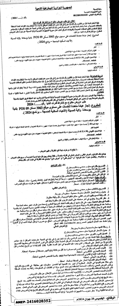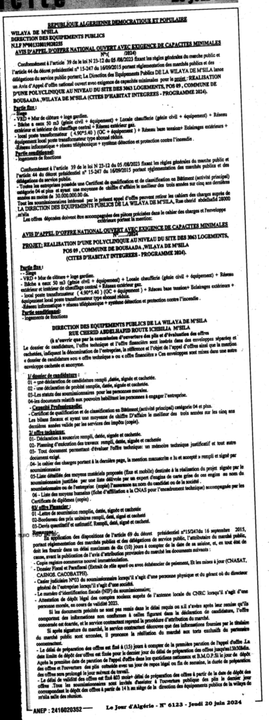 إعلان عن طلب عروض مفتوح انجاز مقر عيادة متعددة الخدمات على مستوى موقع 3063 مسكن POS 09 بلدية بوسعادة/ مديرية التجهيزات العمومية لولاية المسيلة