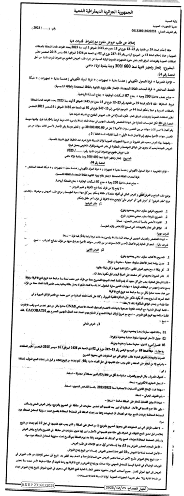 إعلان عن طلب عروض مفتوح: انجاز وتجهيز ثانوية نمط 300/600 وجبة ببلدية أولاد ماضي