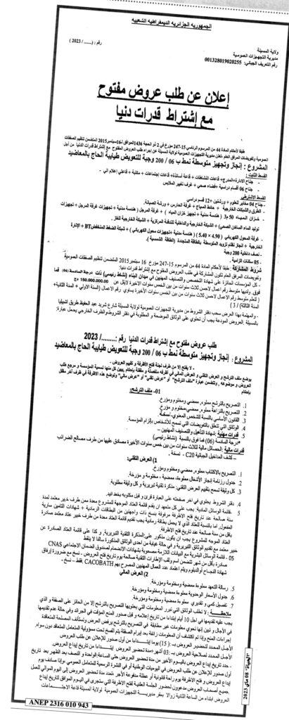 إعلان عن طلب عروض مفتوح: انجاز وتجهيز متوسطة نمط ب 200/06 وجبة للتعويض طيايبة الحاج بالمعاضيد/ مديرية التجهيزات العمومية