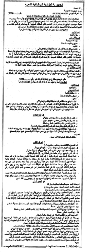 إعلان عن طلب عروض مفتوح: انجاز وتجهيز مقر خزينة الولاية بالمسيلة مع 03 سكنات إلزامية/ مديرية التجهيزات العمومية لولاية المسيلة