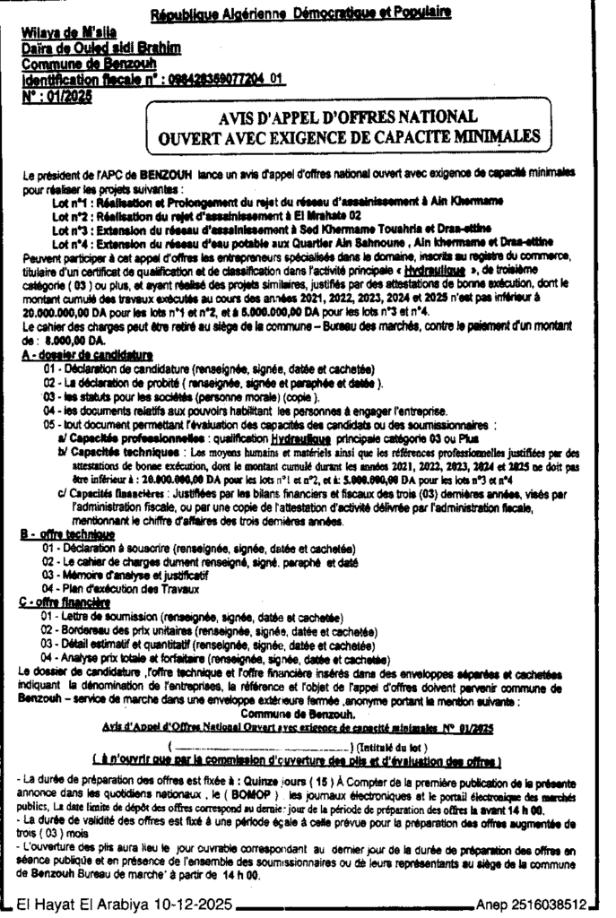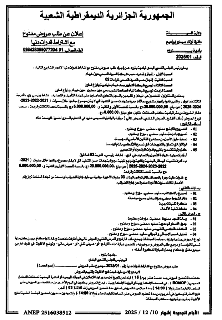 إعلان عن طلب عروض مفتوح انجاز وتمديد مصب الصرف الصحي وتوسيع شبكة المياه/ بلدية بن زوه