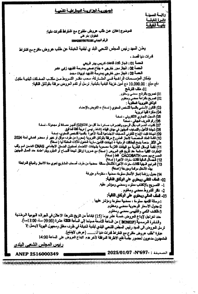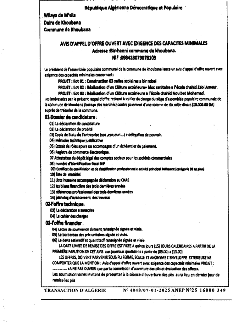 إعلان عن طلب عروض مفتوح انجاز 03 قاعات تدريس ببئر الربعي وانجاز سور خارجي بمدرستي الشهيد نويبات محمد والشهيد زابي عامر/ بلدية الخبانة