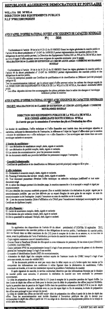 إعلان عن طلب عروض مفتوح انجاز 04 أقسام امتداد للمتوسطة بن عزوز عمار ببلدية محمد بوضياف/ مديرية التجهيزات العمومية لولاية المسيلة