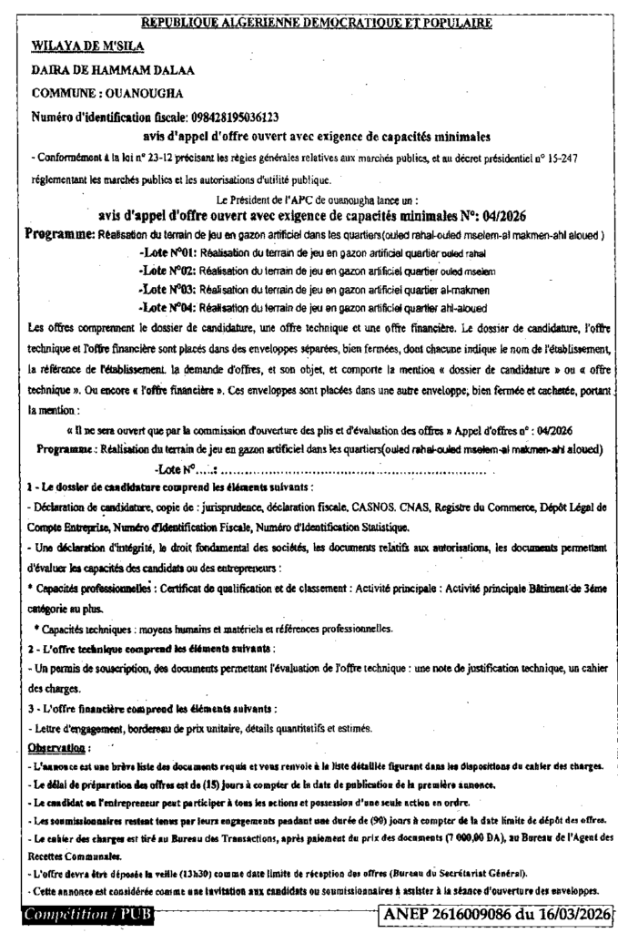 إعلان عن طلب عروض مفتوح انجاز 04 ساحات لعب بالعشب الاصطناعي/ بلدية ونوغة