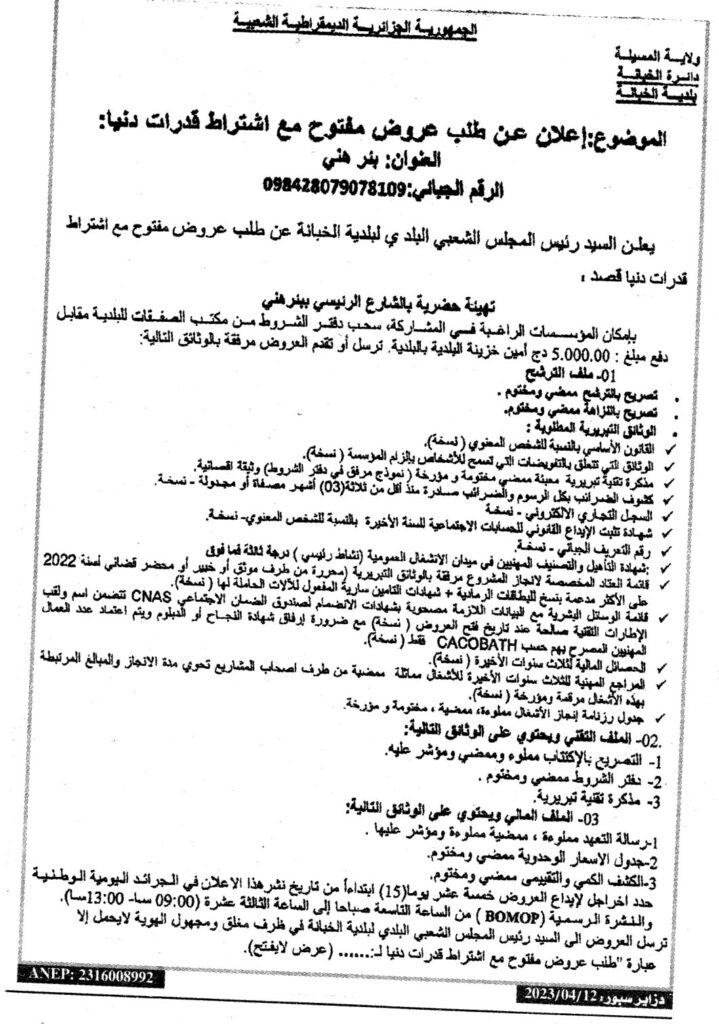 طلب عروض مفتوح مع اشتراط قدرات دنيا قصد: تهيئة حضرية بالشارع الرئيسي ببئر هني12 أبريل، 20230 12 شاركها فيسبوك X مشاركة عبر البريد طباعة