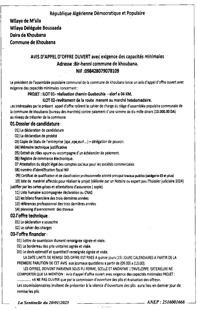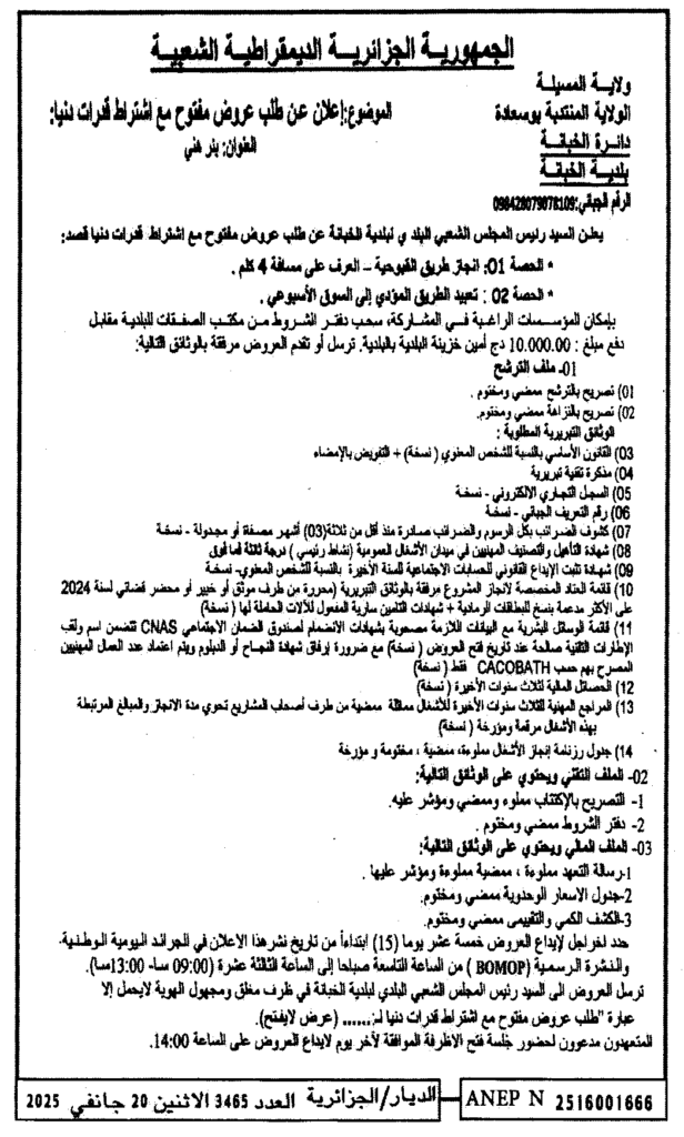 إعلان عن طلب عروض مفتوح / بلدية الخبانة
