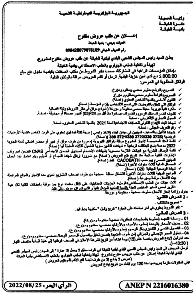 طلب عروض مفتوح لمشروع تهيئة وتغطية الملعب الجواري بالملعب الإصطناعي ببلدية الخبانة25 أغسطس، 20220 26 شاركها فيسبوك X مشاركة عبر البريد طباعة