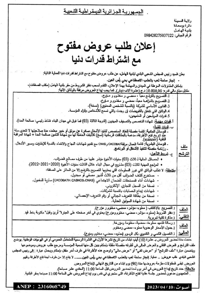 طلب عروض مفتوح مع اشتراط قدرات دنيا للعملية التالية: إنجاز ساحة لعب بالعشب الاصطناعي بحي رأس العين10 أبريل، 20230 23 شاركها فيسبوك X مشاركة عبر البريد طباعة