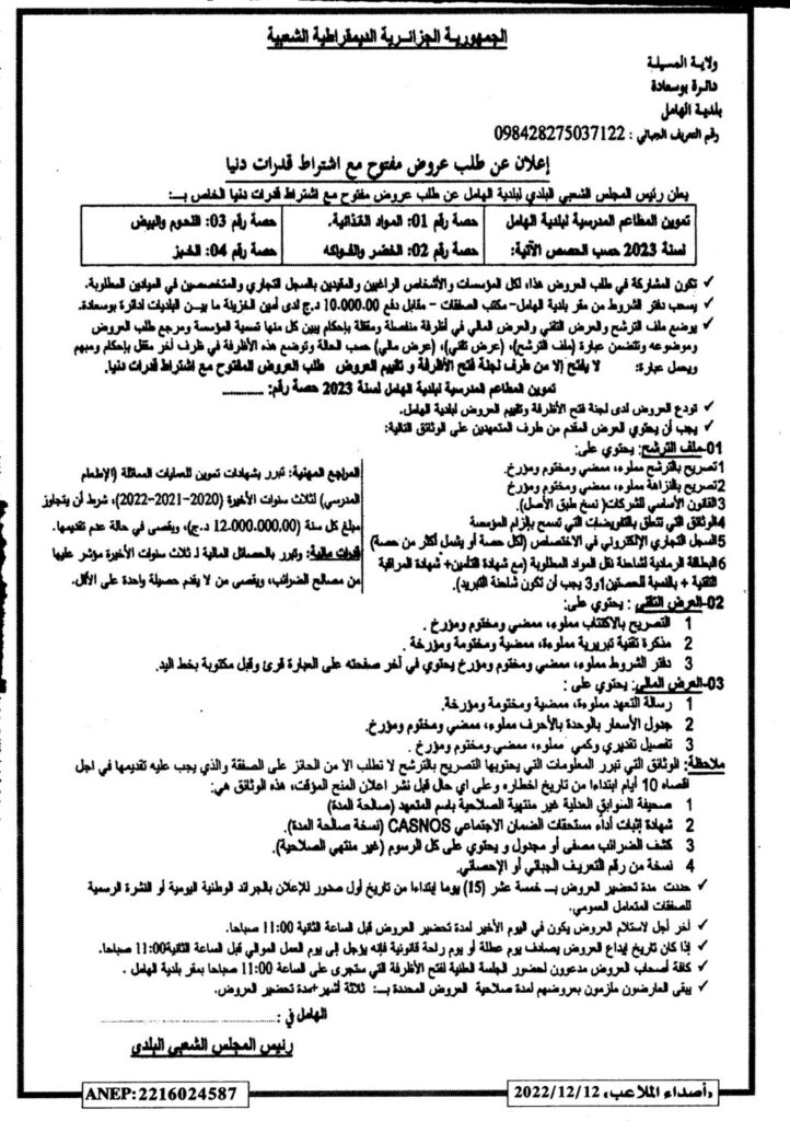 طلب عروض المفتوح مع اشتراط قدرات دنيا لـ: تموين المطاعم المدرسية لبلدية الهامل لسنة 202312 ديسمبر، 20220 20 شاركها فيسبوك X مشاركة عبر البريد طباعة