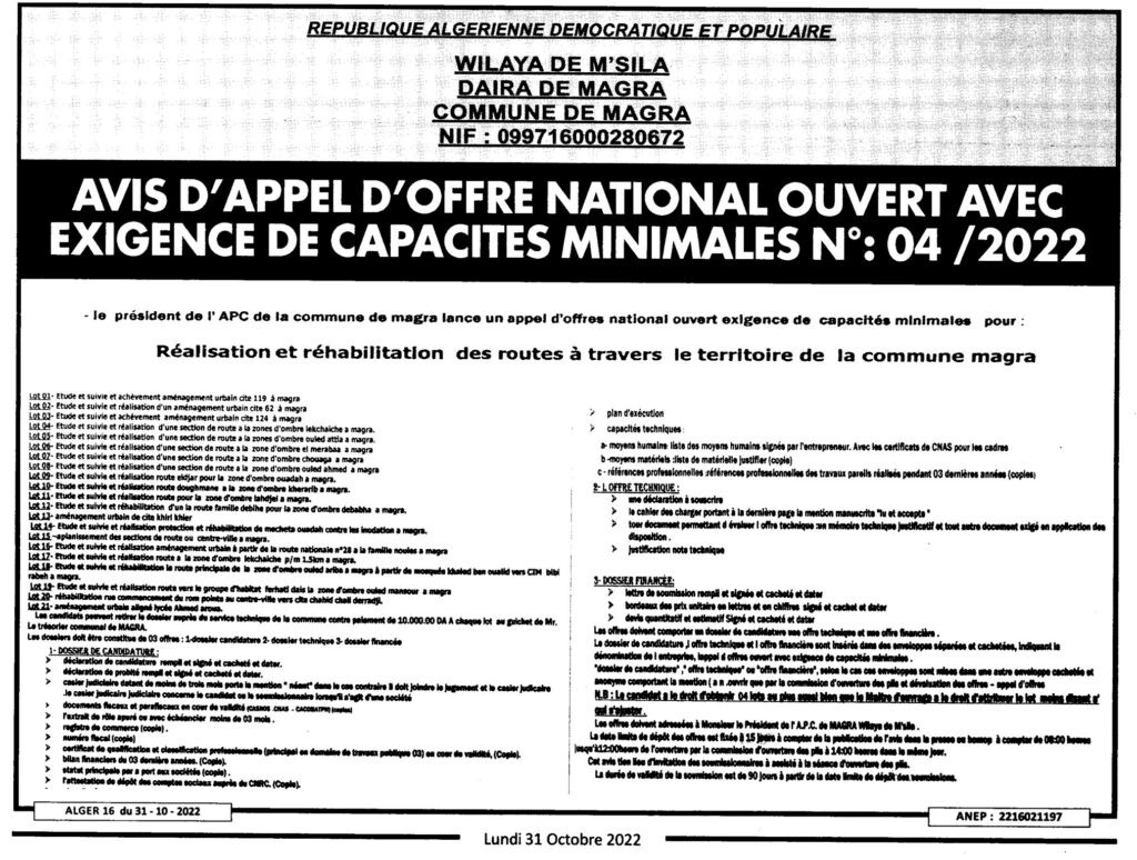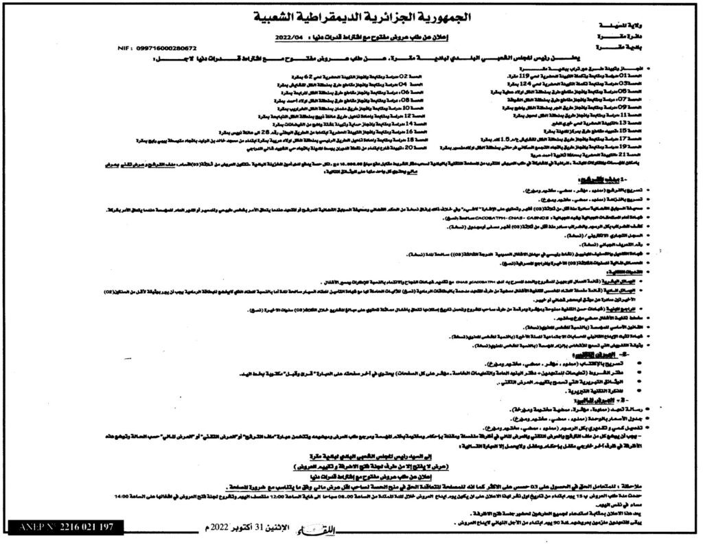 طلب عروض مفتوح مع اشتراط قدرات دنيا لأجل: إنجاز وتهيئة طرق عبر تراب بلدية مقرة (21 حصة)31 أكتوبر، 20220 18 شاركها فيسبوك X مشاركة عبر البريد طباعة