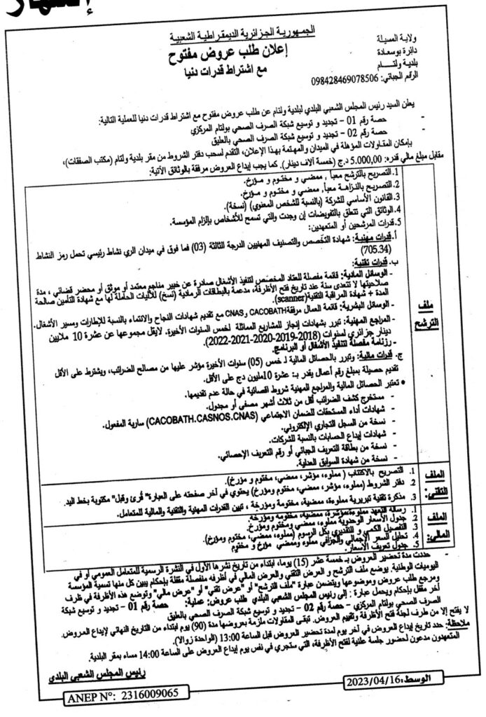 طلب عروض مفتوح مع اشتراط قدرات دنيا للعملية التالية:حصة 01: تجديد وتوسيع شبكة الصرف الصحي بولتام المركزيحصة 02: تجديد وتوسيع شبكة الصرف الصحي بالعليق16 أبريل، 20230 19 شاركها فيسبوك X مشاركة عبر البريد طباعة