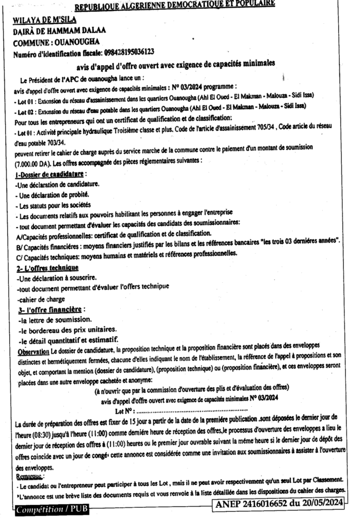إعلان عن طلب عروض مفتوح/ بلدية ونوغة