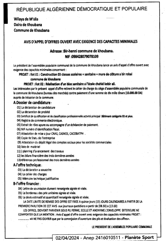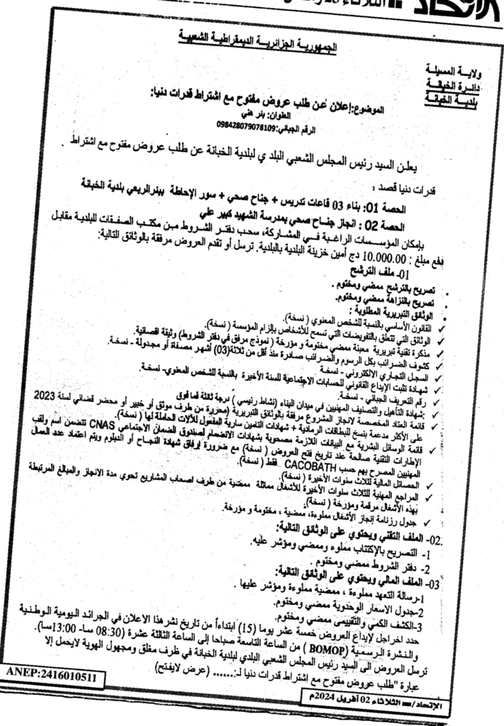 إعلان عن طلب عروض مفتوح: بناء وانجاز ببئر الربعي ومدرسة الشهيد كبير علي/ بلدية الخبانة