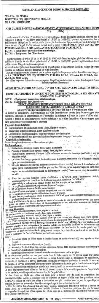 إعلان عن طلب عروض مفتوح تجهيز مركز عقاري ما بين البلديات بسيدي عيسى مع سكنين الزاميين/ مديرية التجهيزات العمومية لولاية المسيلة