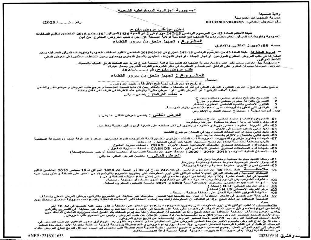 إعلان عن طلب عروض مفتوح: تجهيز ملحق بن سرور القضاء مديرية التجهيزات العمومية لولاية المسيلة