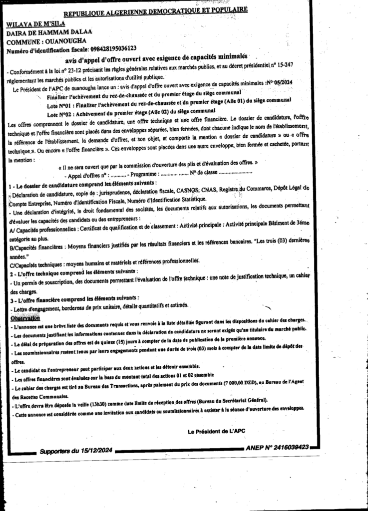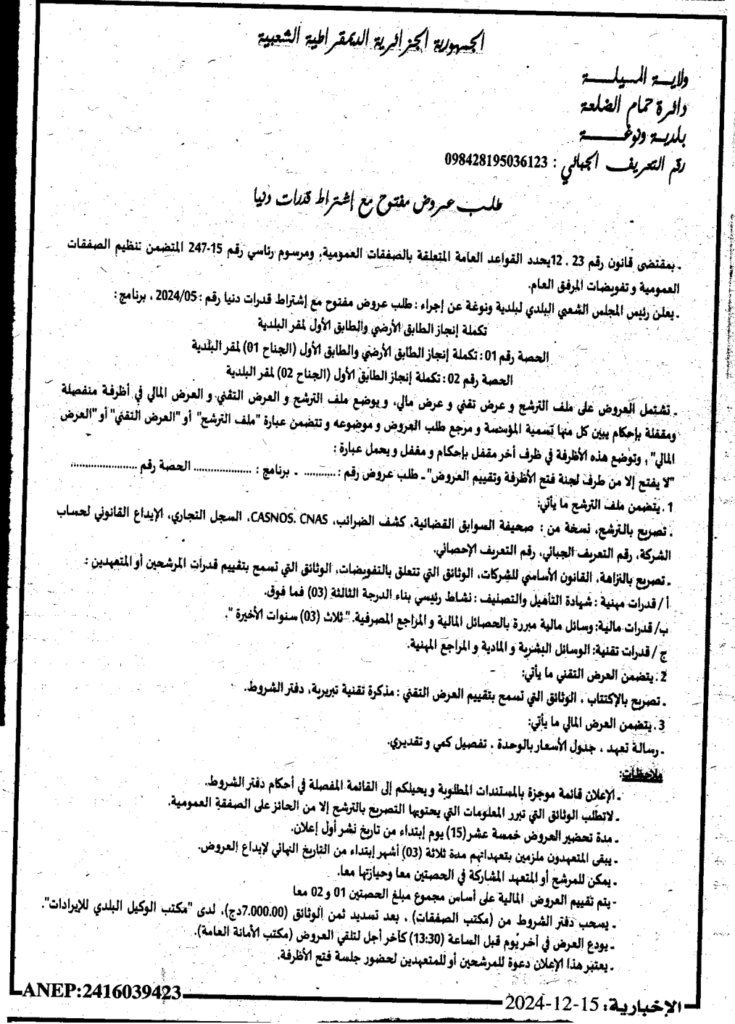 إعلان عن طلب عروض مفتوح تكملة انجاز الطابق الأرضي والطابق الأول لمقر البلدية/ بلدية ونوغة