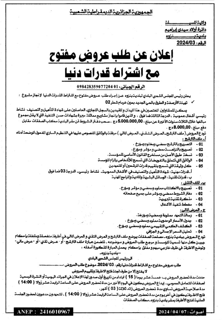 إعلان عن طلب عروض مفتوح: تهيئة الأرصفة والطرق بالحي الجديد بعين خرمام شطر 02/ بلدية بن زوه