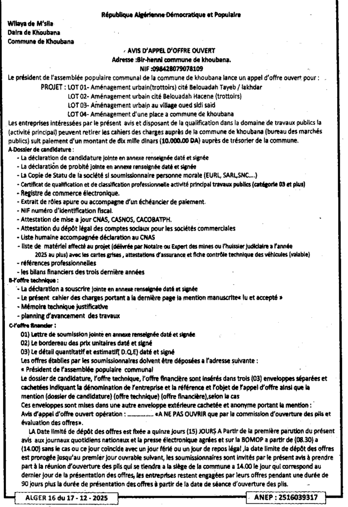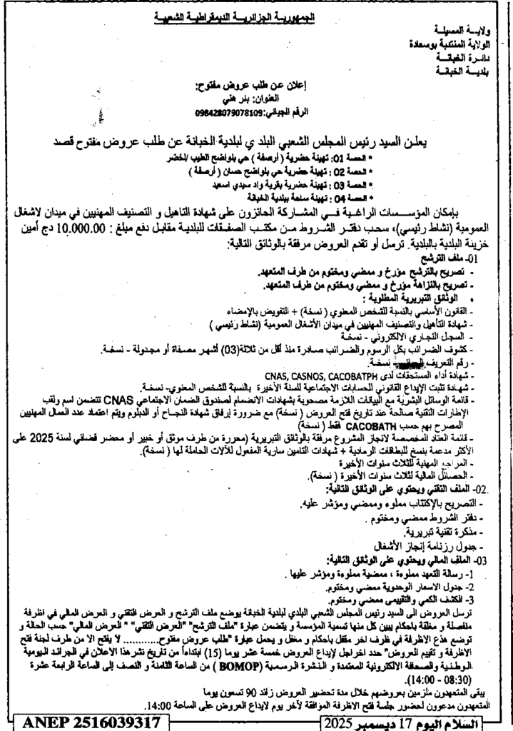 إعلان عن طلب عروض مفتوح تهيئة حضرية/ بلدية الخبانة