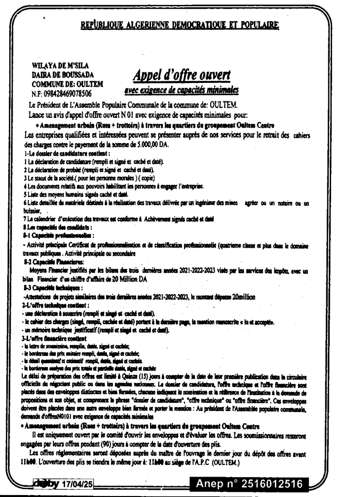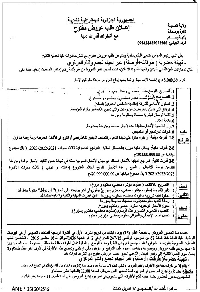إعلان عن طلب عروض مفتوح تهيئة حضرية (طرقات + أرصفة)/ بلدية ولتام
