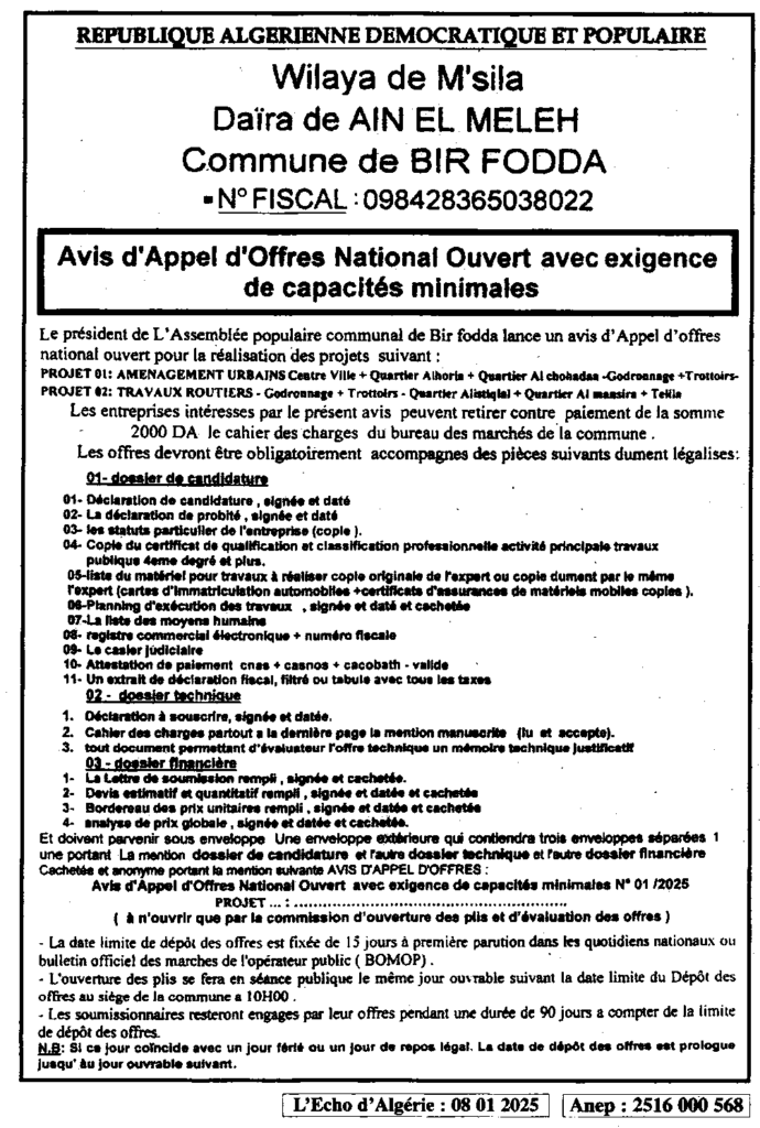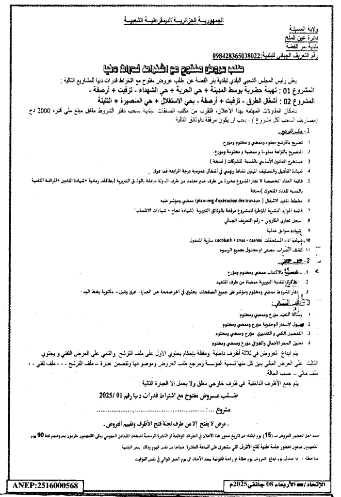 إعلان عن طلب عروض مفتوح تهيئة حضرية وأشغال الطرق/ بلدية بئر الفضة