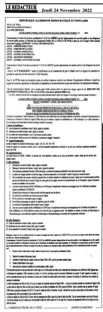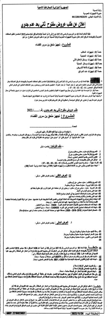 إجراء طلب العروض المفتوح من أجل المشروع: تجهيز ملحق بن سرور القضاء24 نوفمبر، 20220 13 شاركها فيسبوك X مشاركة عبر البريد طباعة