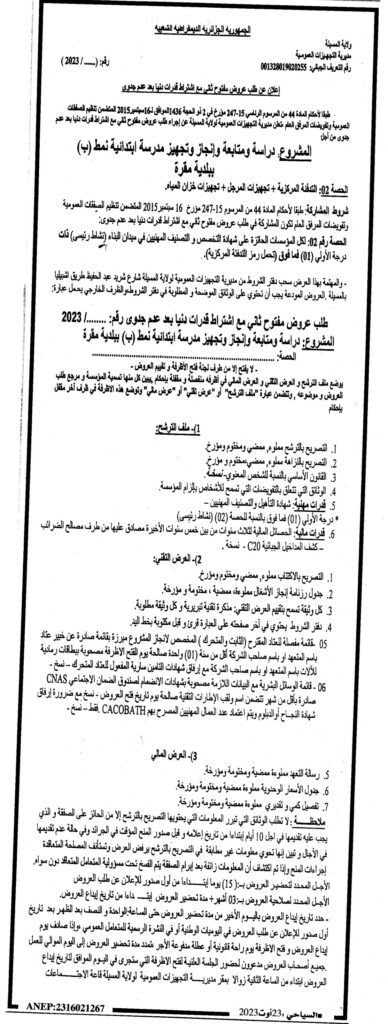 طلب عروض مفتوح ثاني مع اشتراط قدرات دنيا بعد عدم جدوى: دراسة ومتابعة وانجاز وتجهيز مدرسة ابتدائية نمط (ب) ببلدية مقرة23 أغسطس، 20230 23 شاركها فيسبوك X مشاركة عبر البريد طباعة