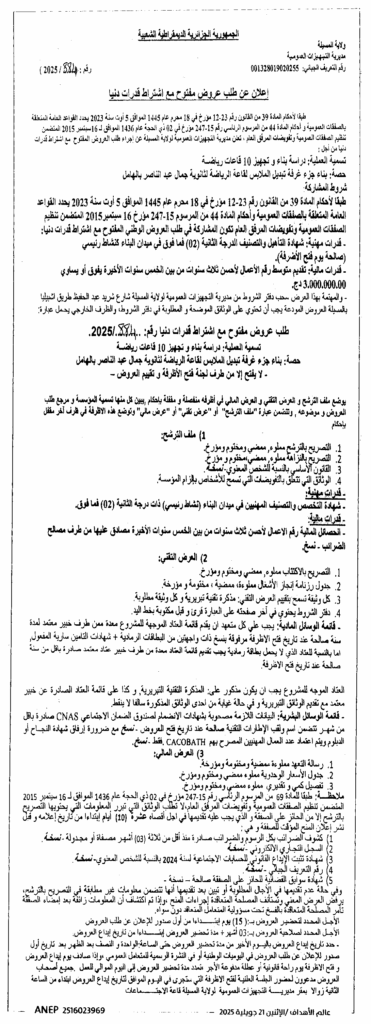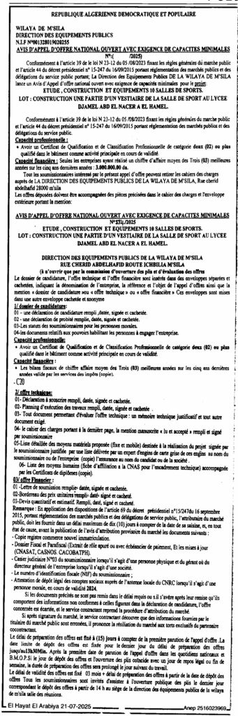 إعلان عن طلب عروض مفتوح دراسة بناء وتجهيز 10 قاعات رياضة/ مديرية التجهيزات العمومية لولاية المسيلة