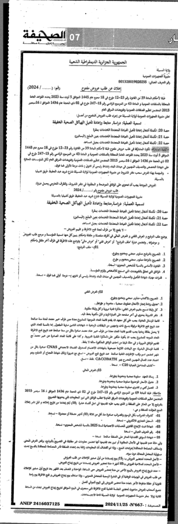 إعلان عن طلب عروض مفتوح دراسة متابعة وإعادة تأهيل الهياكل الصحية الخفيفة/ مديرية التجهيزات العمومية لولاية المسيلة