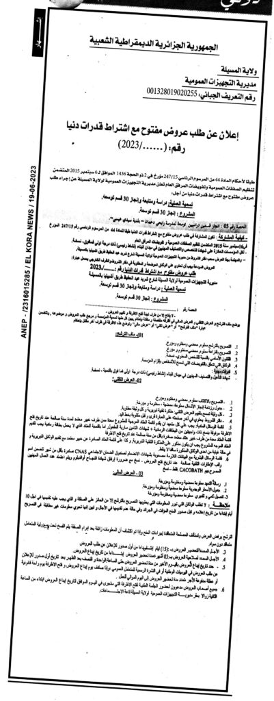 إعلان عن طلب عروض مفتوح: دراسة ومتابعة وانجاز 30 قسم توسعة/ مديرية التجهيزات العمومية لولاية المسيلة